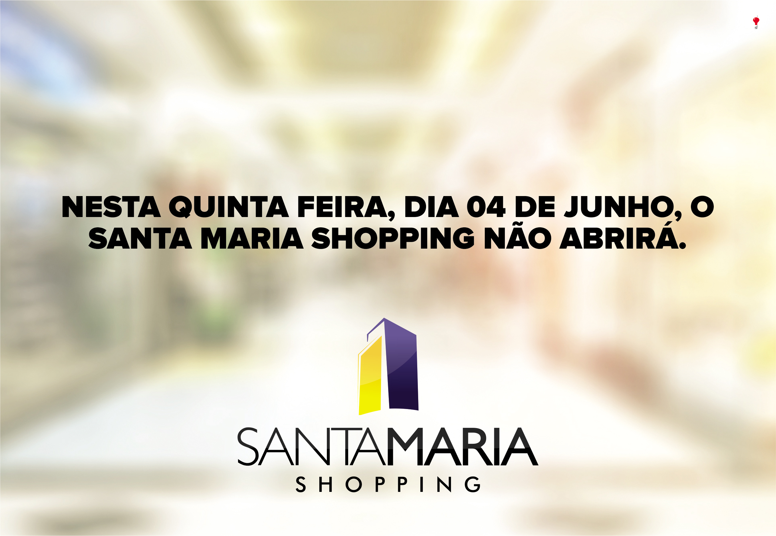 Informamos que no dia 04/06/15 o Santa Maria Shopping não abrirá, em virtude do feriado de Cospus Christi. Mas não se preocupe, no domingo, 07/06/15, estaremos com as portas abertas para você aproveitar o dia com sua família e amigos!