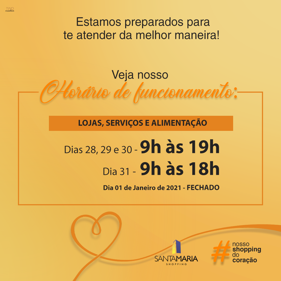 Confira nosso HORÁRIO DE FUNCIONAMENTO: SEGUNDA a SEXTA: das 9h às 19h. SÁBADO: das 9h às 17h. DOMINGO: Fechado. Horários válidos para Lojas, Serviços e Praça de Alimentação Santa Maria Shopping! O Nosso Shopping do coração! ...